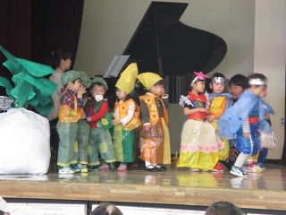 今年度も修了。各クラスでお楽しみ会。未就園児はお母様と一緒お別れ会。リトミック、英語、そしてみんなでおおきなかぶの劇を披露しました。おじいさんおばあさんは絵本通りその他はいろいろな絵本の登場人物で演技しました。白雪姫、赤ずきん、ぶたさん、ピーターパンなど・・。よいしょこらしょ と掛け声をかけ「手伝いますよ」と登場しました。その後ランチも楽しみました。