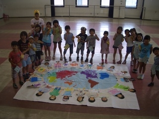盛りだくさんのレク、初めて出会ったお友達との交流、きっと楽しい思い出ができたことでしょう。お泊りを通して新しい1面を発見できる貴重な2日間です。日常の講座では味わうことのできない体験ができたと思います。カブトムシ採りはできませんでしたが公園でセミの羽化見学をしました。眠い目をこすりつつ、探検部隊活躍でした。世界地図でみんな仲間をテーマに制作した写真です。