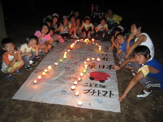 手作りろうそくをともし、東北地図にメッセージをいてエールを送りました。