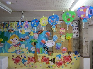 お部屋の中は南国!熱帯魚、かに、ハイビスカスなど様々なうちわを作りました。お外は別世界。例年のようにかき氷、カレー、じゃがバターなど