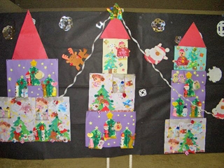 未就園児のクリスマス作品です。会場一面に飾りました。各学年の成長と段階が感じられる素敵な作品に仕上がりました。会場には皆で作ったどんぐりケーキ等も飾られ華やぎました。
