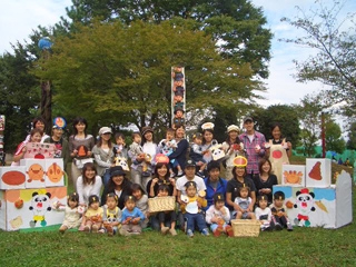 10月の一日流山の運動公園ピクニック広場で親子レクを行いました。「パンパンパンダのパン屋さん」でパンごっこをしたりぶどうを洗濯ばさみで棚につけたり・・ぶどう狩りに行く競技。体操の勉先生とケンパ・絵合わせ・など盛りだくさんの内容でした。日頃お会いする事ができないご家族の皆様とも交流が持て天気にも恵まれ楽しい一日でした。写真はパン屋さんで買ったパンを持ちいいお顔の一枚です。