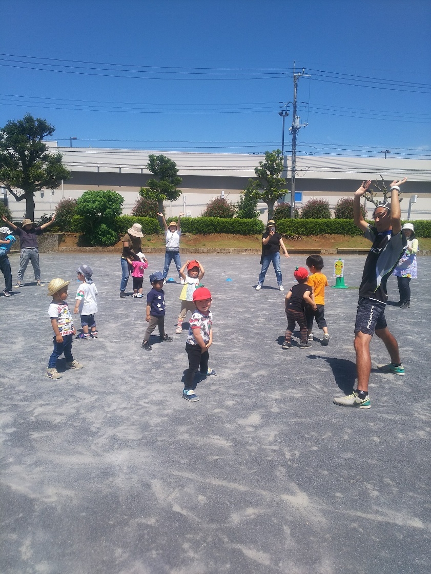 暑すぎて疲れも。水分補給としつつ午前中みんなで頑張りました。年に数回保護者の方とも交流が持てる貴重な一日です。かけっこもママとおててをつないで楽しそう・・体操はコロコロドッチボール、ゴム飛び、親子体操と盛りだくさん。リトミックもジャンベやトライアングル、マラカスなどの打楽器も交えて楽しみました。バスごっこは坂道や急ブレーキなどピアノに合わせて撮って上手に先生の指示をいいお耳できいてひょうげんしていましたよ!。