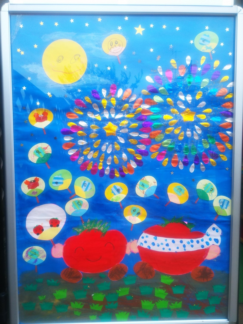 未就園児さんは夏のお遊び。幼、小学生は夏休みですね。トマトは補習もありますので時間を作って2学期に向けての勉強もしていきましょう。8月は「英語でクッキング」Mary先生とお料理します。メニューはMary先生が考案中。きっと楽しい、そして学べる時間になると思いますよ。夏の思い出に是非!参加してくださいね。詳細はお便りで・・。ちびっ子さんたちは新しい畑に行って手作りかかしとご対面しています。トマト名物?の靴の青いカバーはそのままで^^初めてお会いするご近所さんは「それはなんですか?」「どろよけです~」なるほどねーと感心され~。坂を下りて距離はありますが朝の涼しい時に行きます。ちょうど良いお散歩コースです。8月は帰省などで欠席も多い月になります。体調を整えて元気に来てくださいね(*^^)v