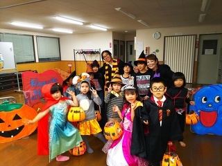 しいの木台教室で初めてのハロウィンパーティーをしました。小さいお友達はゲストさんで花を添えてくれました。よちよちのお友達もトマトからしいのき会館まであるいて途中でキャンディーやたくさんのお菓子をもらいました。Trick・or・Treatの掛け声とともに手作りバックにたくさんのお菓子。小学生はちょっぴり恥ずかしい・・。でも小さいお友達と交流を持つこともとても大切な経験です。楽しい思い出になると思いますよ。Mary先生とゲーム。元気いっぱいの子供たちでした。この日はみんなが主役ですね。小さいお友達の可愛い姿・・写真には写っていませんがとってもかわいかったですよ💛