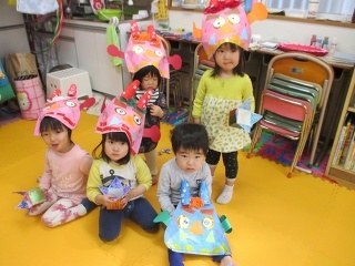 今日は節分。立春ですね。今週は各クラスで豆まきしました。大きな鬼のお面につのばこを作って新聞で作ったたくさんのお豆を部屋中にまいて悪い鬼を追い払いました。かわいい鬼さんたちはまだ意味がわからないので逃げ回ったりお豆を拾ったり楽しみました。福がたくさん訪れますように。年の数だけお豆も食べました。きっと2月も駆け足で過ぎそうですよね。一日一日を大切に過ごしたいと思います。幼稚園児は風邪ひき、インフルエンザなどで欠席が目立ちます。手洗いうがいを忘れずに!!